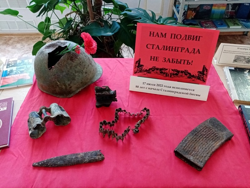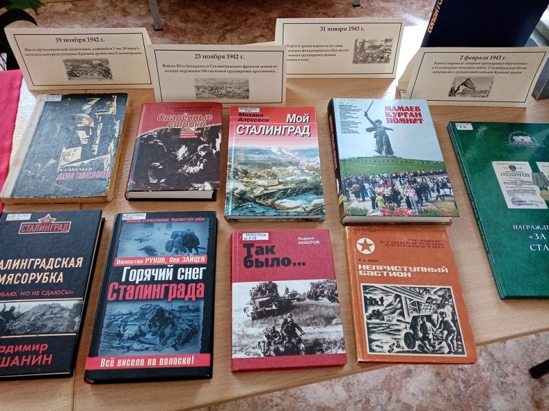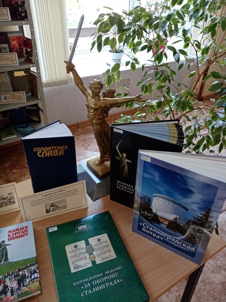 В преддверии этой даты в библиотеке-филиале №4 им. Ю.В. Бондарева оформлена выставка-инсталляция "Нам подвиг Сталинграда не забыть!". Помимо книг о Сталинградской битве, на выставке представлено несколько военных артефактов периода битвы.