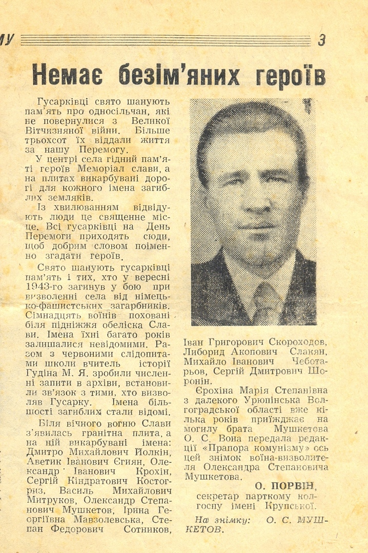 До конца 1960-х годов мы не знали точного места захоронения моего деда, но осенью 1968 года моей бабушке, Мушкетовой Марфе Васильевне, пришло письмо от красных следопытов и директора краеведческого музея села Гусарка о том, что при перезахоронении погибших солдат в Братскую могилу были найдены солдатский жетон и солдатская книжка на имя Мушкетова Александра Степановича и он теперь покоится на центральной площади села. Так же её пригласили по возможности посетить Гусарку и рассказать о солдате. Поездку удалось осуществить в 1971 году. Первый раз Братскую могилу навестили его жена и сестра Мария Степановна, там они встретились с красными следопытами и директором сельского краеведческого музея М.Я. Гудина, который вручил им шкатулки с землёй с Братской могилы. Было много встреч с жителями села, очевидцами военных событий и участниками перезахоронения. Второй раз на могилу деда ездили его сестра и дочь (моя мама) в 1975 году, они принимали участие в торжествах к 30-летию Победы.
