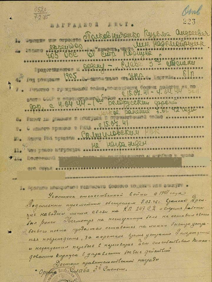 Медаль «За отвагу» - наградной лист дата 07.02.1945 г.