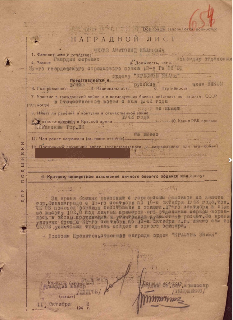 Участник взятия высоты 102 (Мамаев Курган), снайпер 3-ей стрелковой роты 1-го батальона 39-го полка Анатолий Чехов за время уличных боёв – с 21 сентября по 10 октября 1942 года – уничтожил тридцать солдат и одного офицера противника, за что был представлен к ордену Красного Знамени, который получил 6 ноября 1942 года.