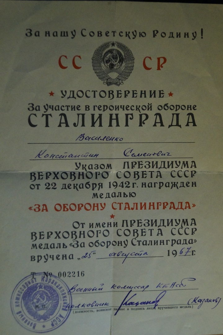 Защищал город Сталинград, имел удостоверение за участие в героической обороне Сталинграда и награжден медалью «За оборону Сталинграда».
